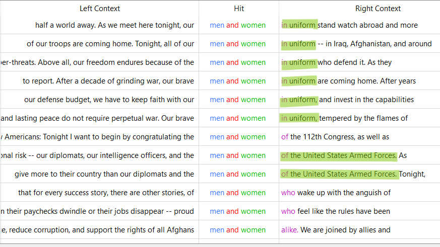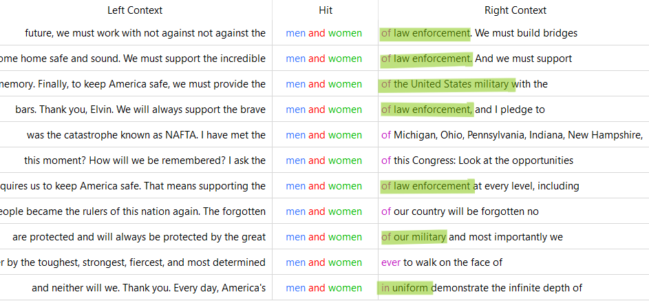 One of the 3 word n-grams is "men and women", which looks moderately the same with the surrounding context for both Obama and Trump.