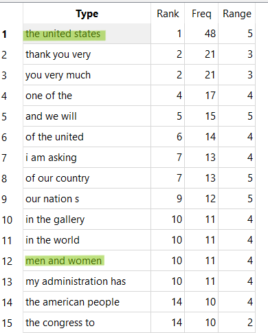 When taking a first glance at the n-gram clusters of two, it immediately jumped out to me that the first two most frequent n-grams were "in the" and "of the". The rest of the n-grams that they share involve inclusive and motivating language using words like "we will", "we have", "the world", and "our". These were similarities I did not expect to see, but make sense given that both of them are political figures urging change in policies and government within the United States. It only makes sense to have a motivating and inclusive tone.