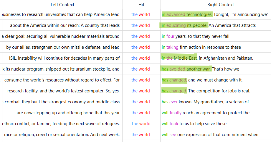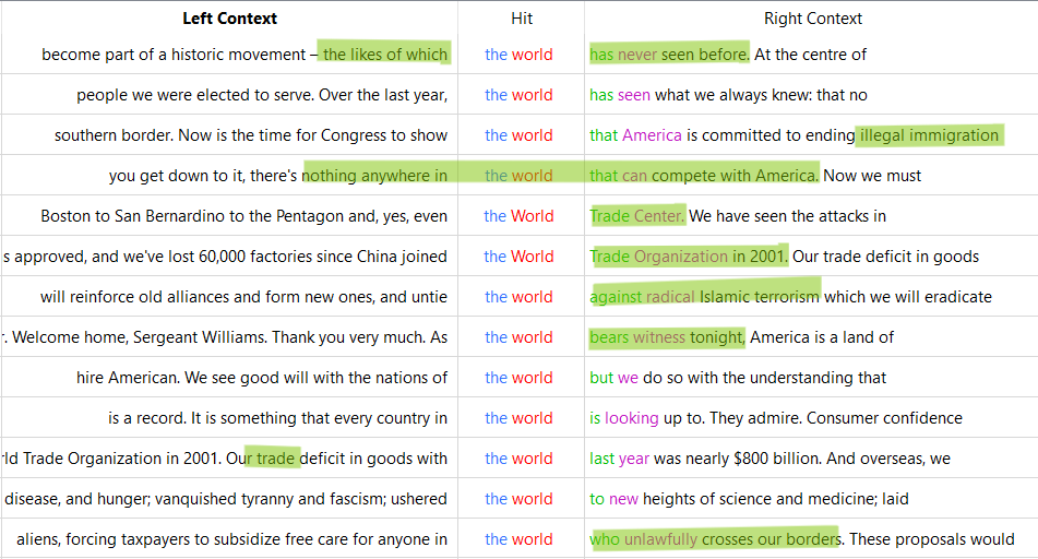 I took a closer look at the specific 2 word n-gram "the world" for both Obama and Trump. I wanted to see if the n-gram's that were the same had consistency in context as well.