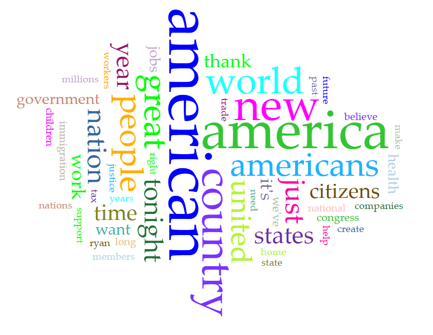 On the other hand, I was able to gather from Trump's word cloud that his main beliefs center around the country of the United States of America, its citizens (which is very specific language, and different from Obama), the government, companies, immigration, giving thanks, and talking about concepts of time. This is all slightly different from what Obama is centered around, and both of which make sense for what they have put forth into policy.